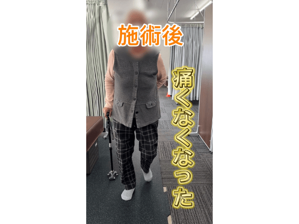 87歳の女性。 5年前に脊柱管狭窄症と診断されてから、お薬や湿布をもらって過ごしていたのですが、 歩く時の痛みが取れず、 高齢なこともあり 手術ができないとのことで当院へご来院されました。もともと 散歩をされている方なので回復が早く、 1回目の施術で痛みが取れ、杖がなくても歩けるようになっています。