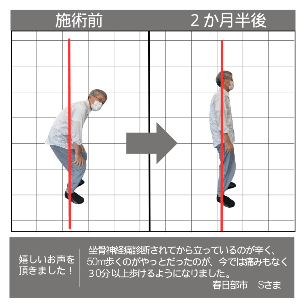 坐骨神経痛で立つのも大変だったのが、今では痛みも感じなくなりました。
